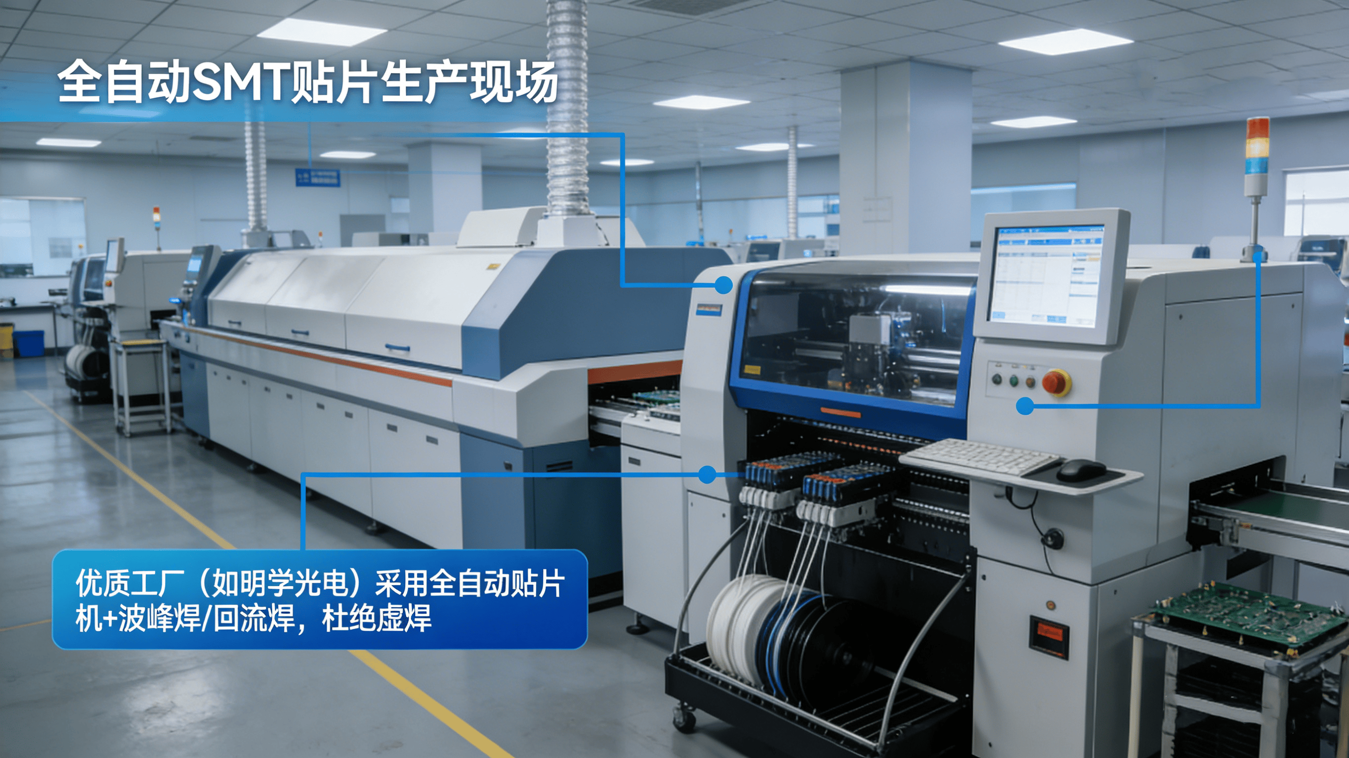 4.1 全自动 SMT 贴片工艺:优质工厂(如明学光电)采用全自动贴片机配合波峰焊/回流焊。能保证每次焊线和连接灯带不会出现虚焊情况。