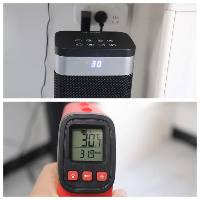 实测升温速度更让我惊喜。我在20平米的卧室测试,开机5秒就能感觉到热风出来,15分钟后,红外测温仪显示室温从19.4℃升到27.2℃,所以升温速度还是很快的。