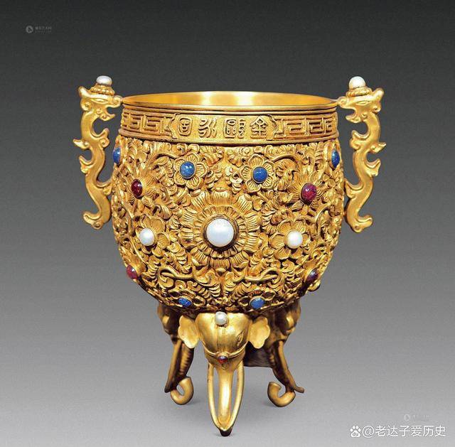 **清-金瓯永固杯** 金瓯永固杯是清朝乾隆皇帝亲自设计的酒杯,完全由黄金打造。杯身雕刻精美,镶嵌了珍珠和宝石,展示了国家的强大和权威。这件酒杯如今是乾隆时期工艺的代表之作。
