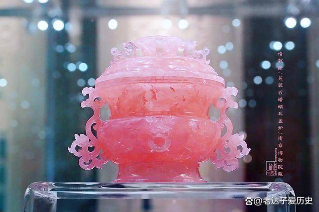 **清-芙蓉石蟠螭耳盖炉** 这件清朝乾隆时期的芙蓉石蟠螭耳盖炉现收藏于南京博物院。它的整体设计大气而规整,由天然粉红色芙蓉石雕琢而成。蟠螭和小蟠螭相互呼应,盖炉晶莹剔透,宛如凝脂。整个作品展现了极高的工艺技巧,是一件罕见的艺术珍品。