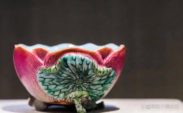 **清-乾隆粉彩绿里花形盃** 这件粉彩绿里花形盃现陈列于苏州博物馆,器型粉嫩可爱,展示了江南之美。莲瓣下方翠绿的叶片与杯子内的湖蓝釉面交相辉映,仿佛一池盛开的荷花在雨中的江南绽放。