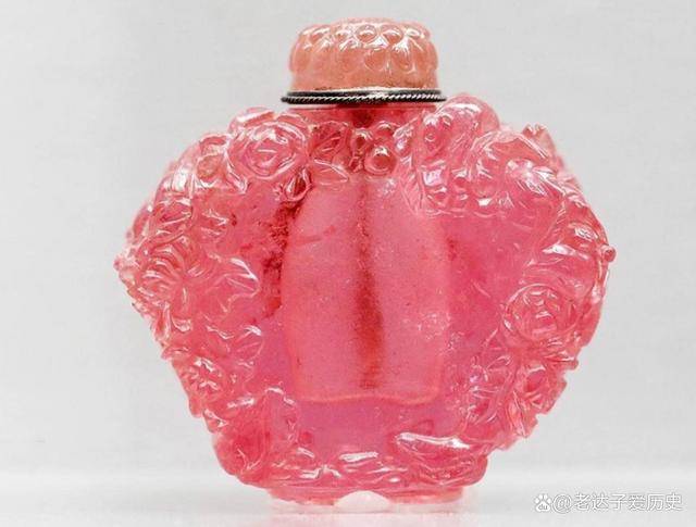 **清-碧玺雕花鼻烟壶** 这款鼻烟壶采用粉红碧玺雕刻,壶身镶嵌桃花浮雕,雕工精细。鼻烟壶晶莹剔透,既有贵气又显得粉嫩可爱,是一件吸引眼球的艺术品。如今,这件珍贵文物被收藏在美国旧金山亚洲艺术博物馆。