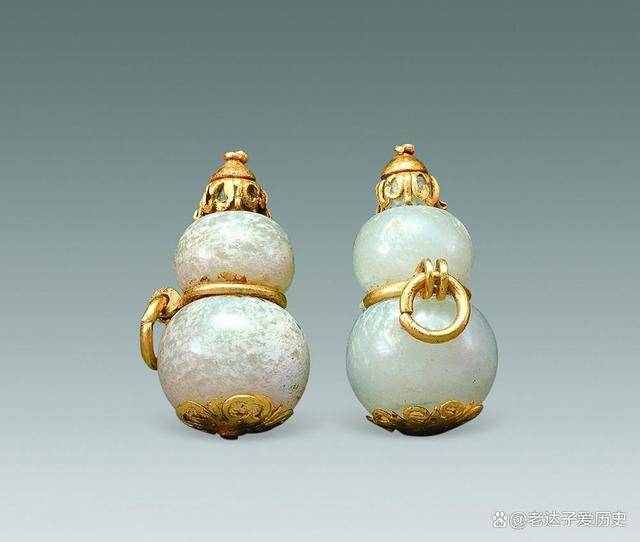 **明-金环白玉葫芦** 这对葫芦形耳坠出土自明朝梁庄王墓,现收藏于湖北省博物馆。采用白玉雕琢,金环镶嵌,造型小巧而精致。尽管尺寸不大,却展现了极高的工艺水平,是明代金镶玉耳坠中的珍品。