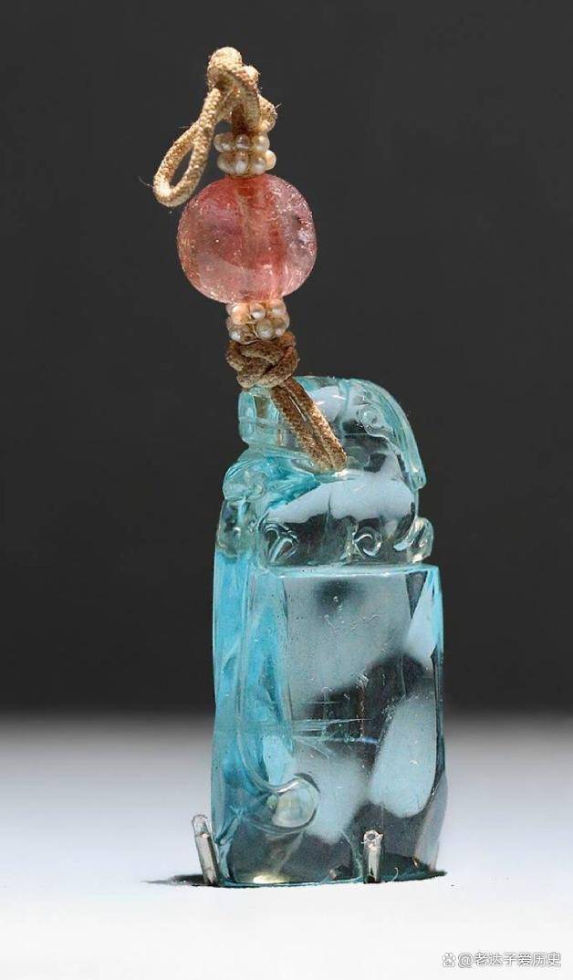 **清-海蓝宝碧玺坠饰** 这件坠饰目前收藏于台北故宫博物院,采用了极其纯净的海蓝宝石雕刻。它的设计展现了海洋的浪漫与晴空的清澈,既清新可爱又深沉宁静,犹如一颗淡蓝色的冰晶,透着清凉的气息,是酷暑中的绝佳佩饰。