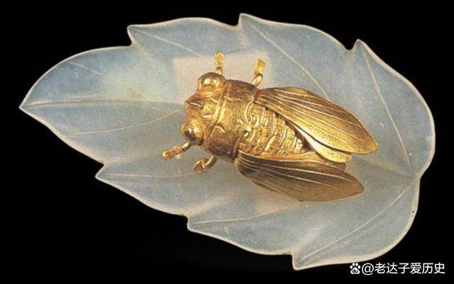 **明-金蝉玉叶** 这件金蝉玉叶来自苏州五峰山的张安晚家族墓,现收藏于南京博物院。玉叶雕刻精细,采用和田羊脂玉,质地温润且细腻。叶脉立体而清晰,仿佛真正的玉叶。金蝉躺在玉叶上,表情自然传神,作品极具艺术价值,展现了极高的工艺技巧。