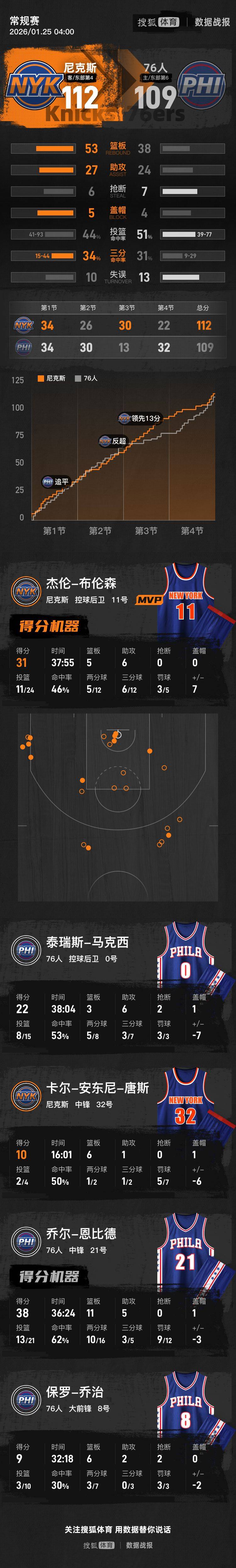 【搜狐体育战报】北京时间1月25日NBA常规赛,客场作战的尼克斯以112-109击败76人。哈特10分14篮板7助攻,恩比德38分11篮板5助攻。