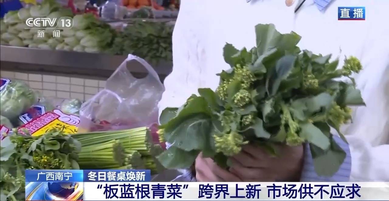 除了这些家常蔬菜,还有一些不一样的。比如板蓝根青菜,这不是大家熟知的药材板蓝根,而是经过板蓝根和油菜杂交而成的新型蔬菜,在2025年首次大规模上市。店主介绍,它的口感没有板蓝根的苦涩,取而代之的是一股脆甜。它对烹饪手法要求不高,清炒或涮煮都可以,是近期市场上比较热销的新品。板蓝根青菜耐寒性强,如今广西玉林等地新引进良种进行种植,市场供不应求。