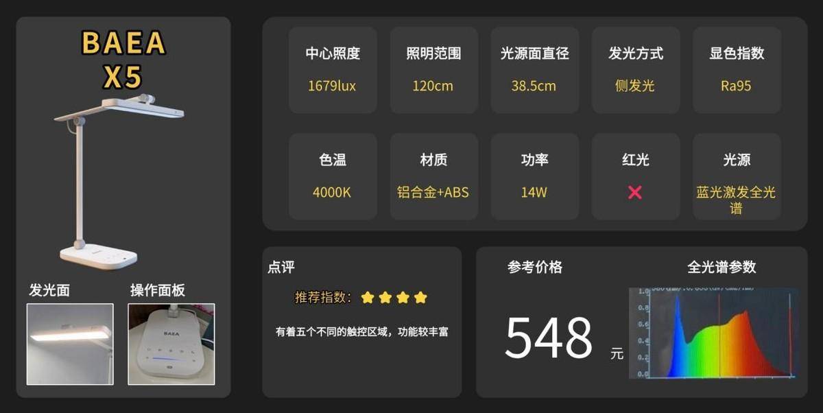 在照明设计上BAEA X5配备了38.5cm的矩形发光面,采用侧发光技术使光线在折射过程中更加柔和且分布均匀,避免直射带来的刺眼感,长时间使用也更舒适。光照范围可覆盖约120厘米的桌面。