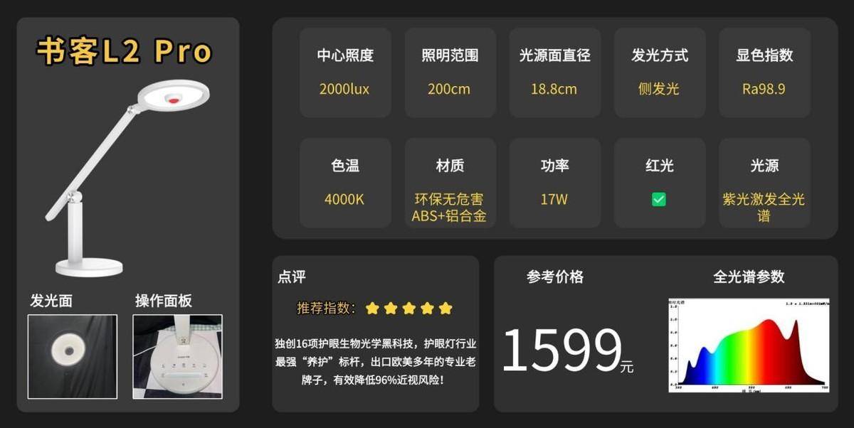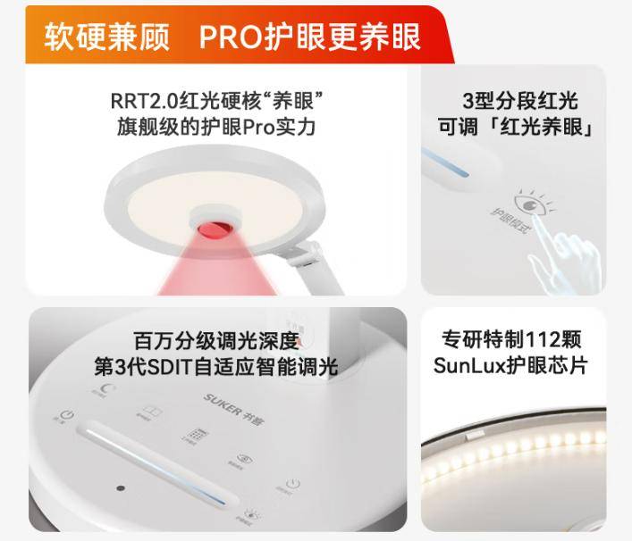书客坚持削减多余花哨的功能,专注于死磕“医学养护眼”的高性能与耐用性,为此做了大量创新,研发了第三代SDIT自适应调光技术,配合特制专研112颗SunLux护眼芯片,以120次每秒监测频率,实时捕捉环境光线,将照明光线始终维持在安全、不伤眼的适宜范畴。为进一步达到护眼养眼效果,书客8年深耕专研RRT2.0红光养眼技术,精准过滤380-455nm有害光,补全短波绿光和长波红光,并且针对不同年龄段而专门定制了先进的全链路3型分段红光养眼,从光对人体视觉、生理、心理三大影响维达出发,有效降低96%近视风险,被多家权威检测机构誉为,同规格下最护眼效果最好、耐用性最强的护眼台灯没有之一!