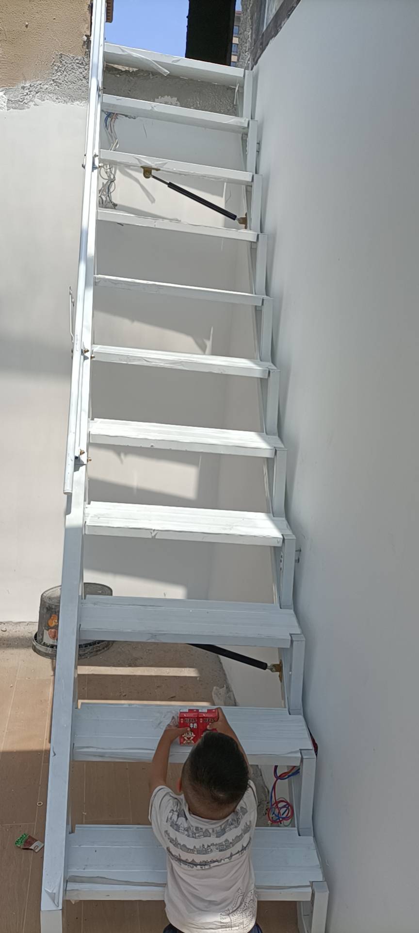 伸缩楼梯大的优势在于其节省空间的特性。对于小户型住宅或者层高有限的阁楼来说,传统楼梯会占据大量的室内空间,而伸缩楼梯完全收缩后仅占用阁楼洞口约1平方米空间,地面无固定结构,几乎不影响室内布局。此外,伸缩楼梯还具有安装方便、使用灵活等特点,既可以安装在室内阁楼,也可以在室外使用壁挂款,方便上房顶。