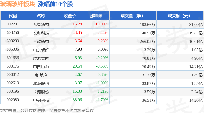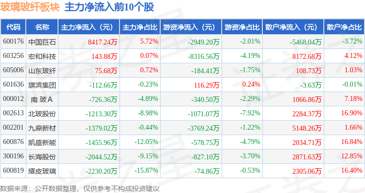 从资金流向上来看,当日玻璃玻纤板块主力资金净流出5.51亿元,游资资金净流入1440.74万元,散户资金净流入5.36亿元。玻璃玻纤板块个股资金流向见下表: