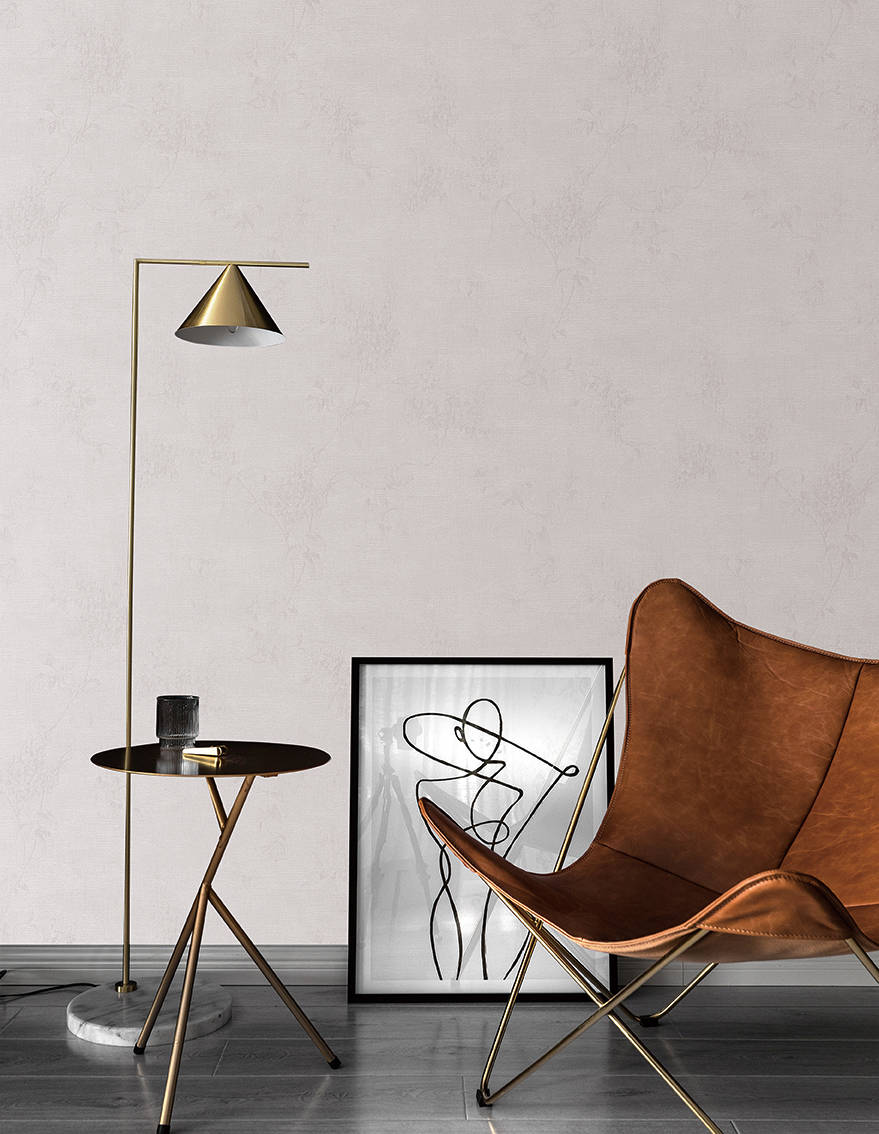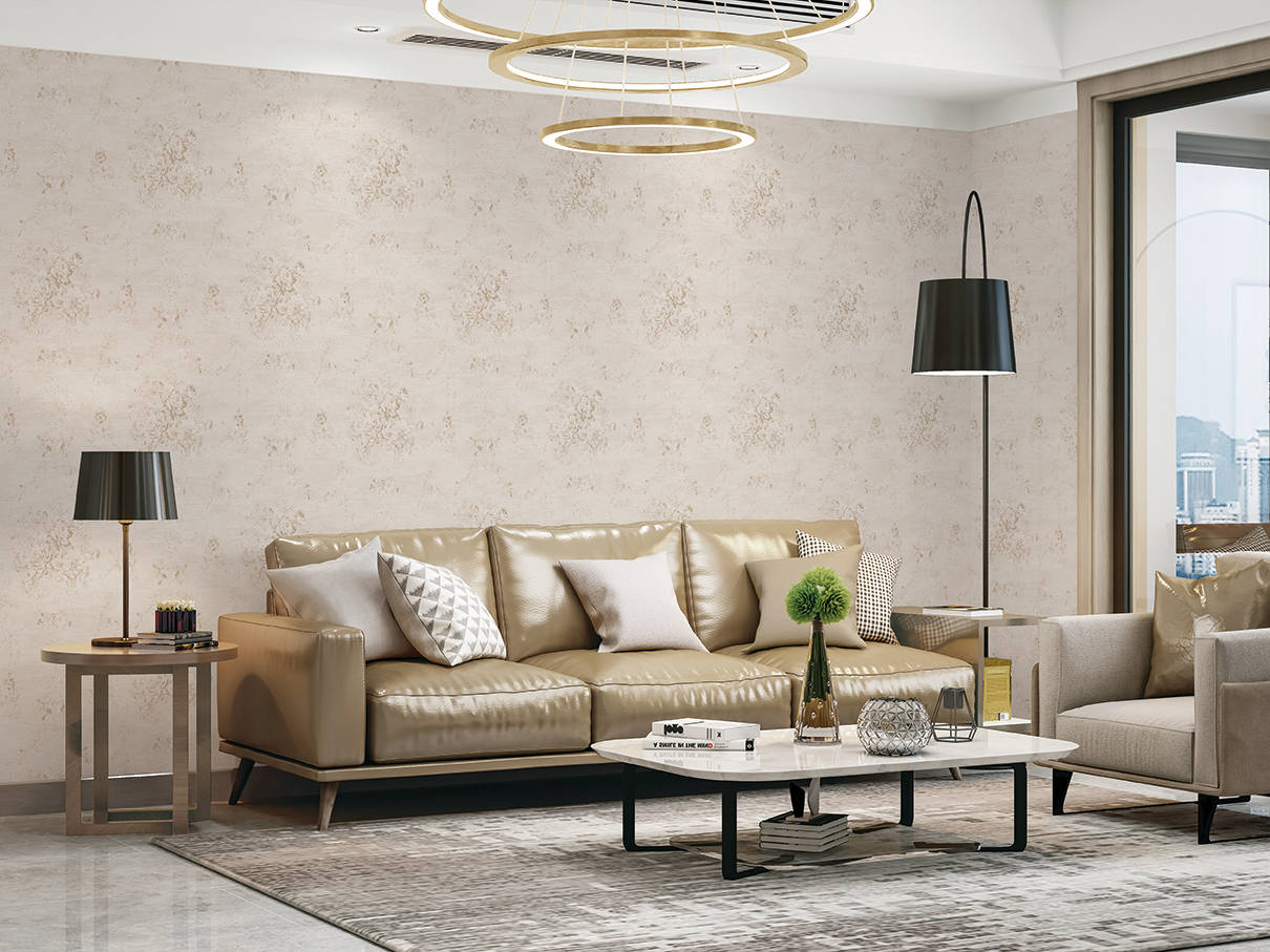 家具:选香槟金色皮质沙发、浅灰色单人椅,呼应墙布的珠光质感。