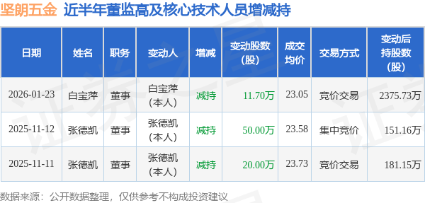 证券之星消息,根据1月26日市场公开信息、上市公司公告及交易所披露数据整理,坚朗五金(002791)最新董监高及相关人员股份变动情况:2026年1月23日公司董事白宝萍共减持公司股份11.7万股,占公司总股本为0.0331%。变动期间公司股价下跌0.35%,1月23日当日收盘报23.02元。