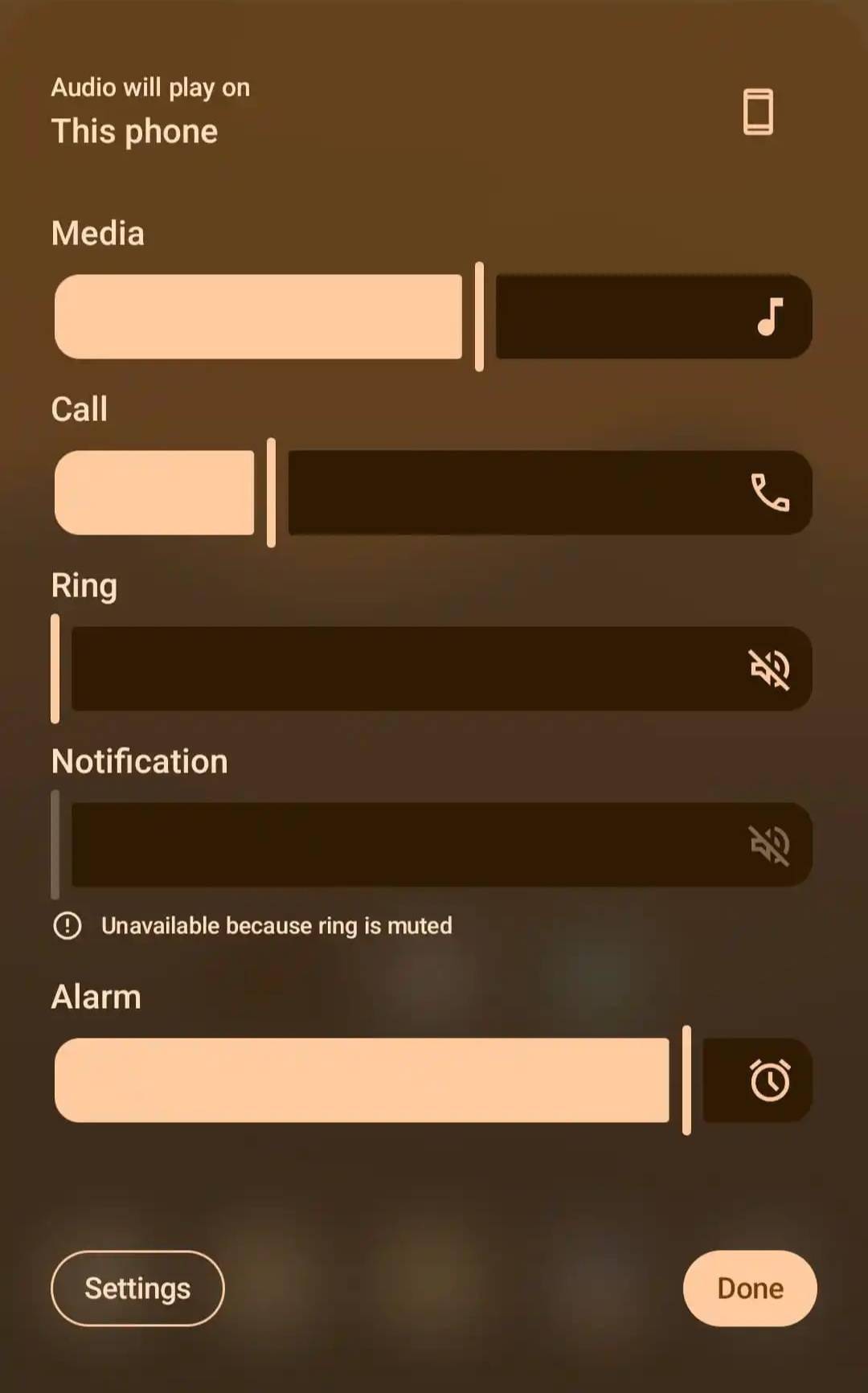 该方案不仅能让用户隐约看到底层的壁纸图案,还完美适配了动态取色(Dynamic Color)主题引擎,音量面板底部启用新图标,替代传统的“...”设计。IT之家附上相关截图如下: