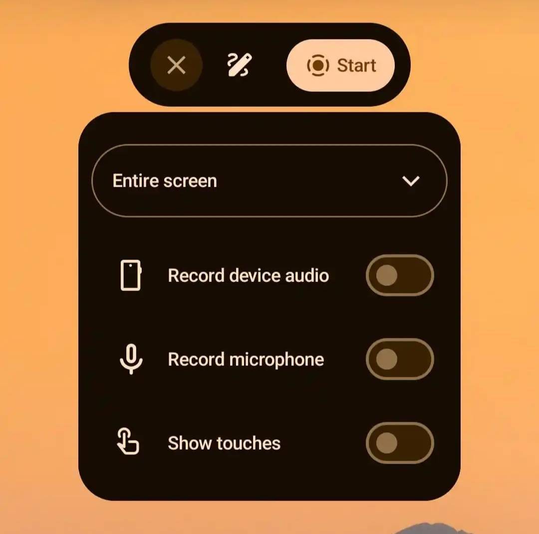 交互方面,新版录屏工具不再以全屏弹窗形式遮挡视线,而是启用了一个更为轻量的悬浮胶囊(Floating Pill)界面。用户在选择“录制全屏”后,可快速切换录制设备音频、麦克风声音及显示触摸操作等选项。