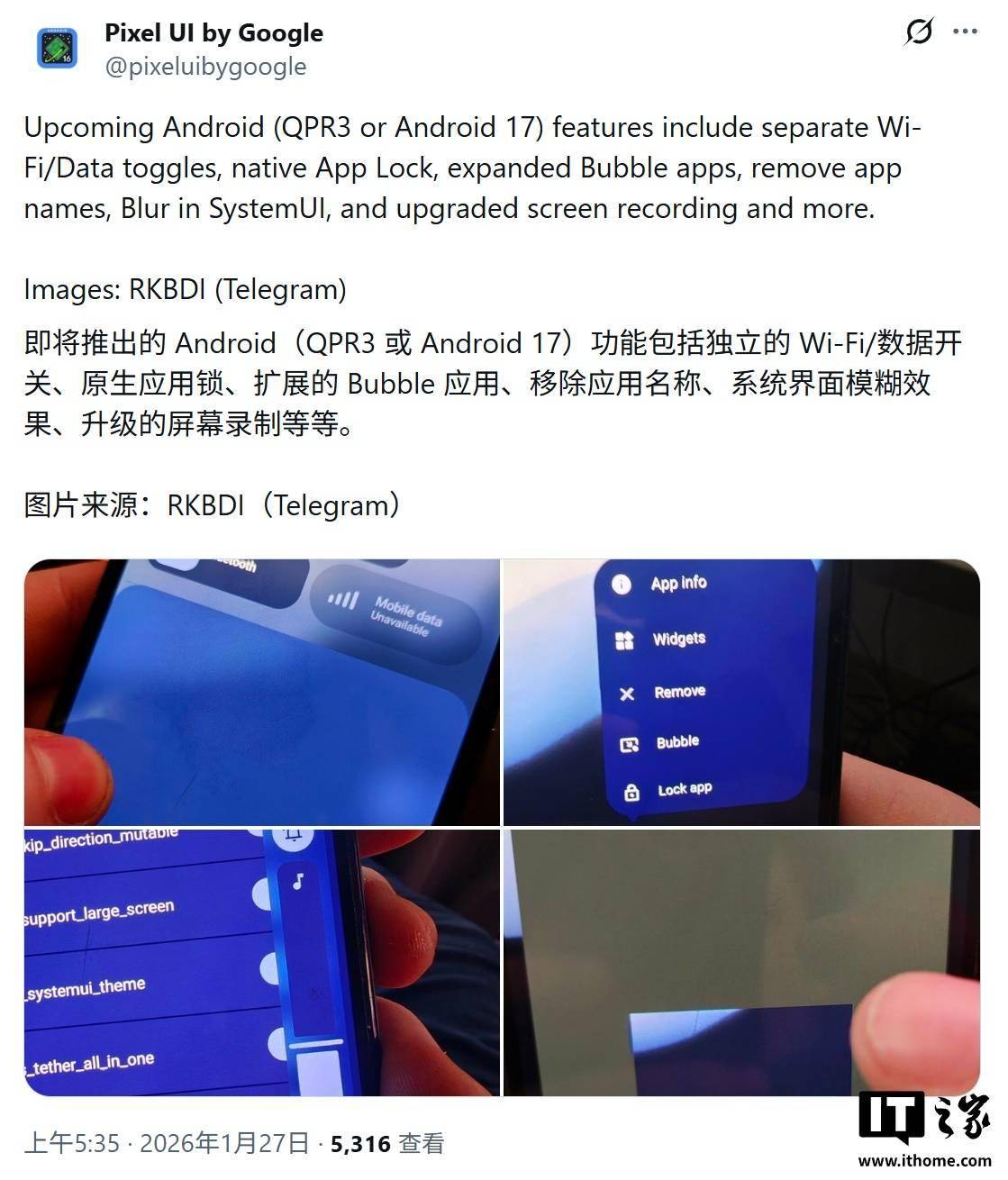IT之家 1 月 27 日消息,消息源 @RKBDI 今天(1 月 27 日)在 X 平台发布推文,分享了一组截图,展示了谷歌安卓 17 内部构建版本,聚焦 UI 视觉与功能交互上的变化。