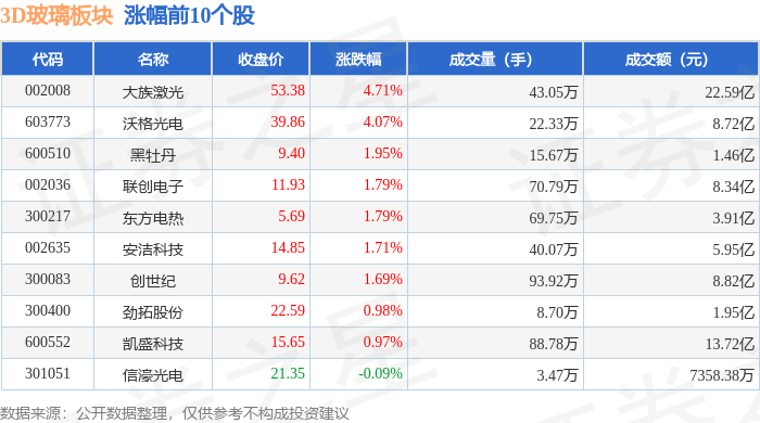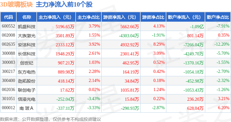 从资金流向上来看,当日3D玻璃板块主力资金净流出9.5亿元,游资资金净流入1.78亿元,散户资金净流入7.73亿元。3D玻璃板块个股资金流向见下表: