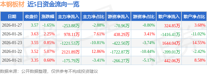 证券之星消息,截至2026年1月27日收盘,本钢板材(000761)报收于3.57元,下跌1.65%,换手率0.67%,成交量24.67万手,成交额8825.7万元。