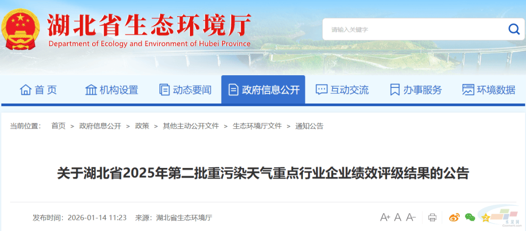 2026年1月14日,湖北省生态环境厅正式公布2025年第二批重污染天气重点行业企业绩效评级结果。