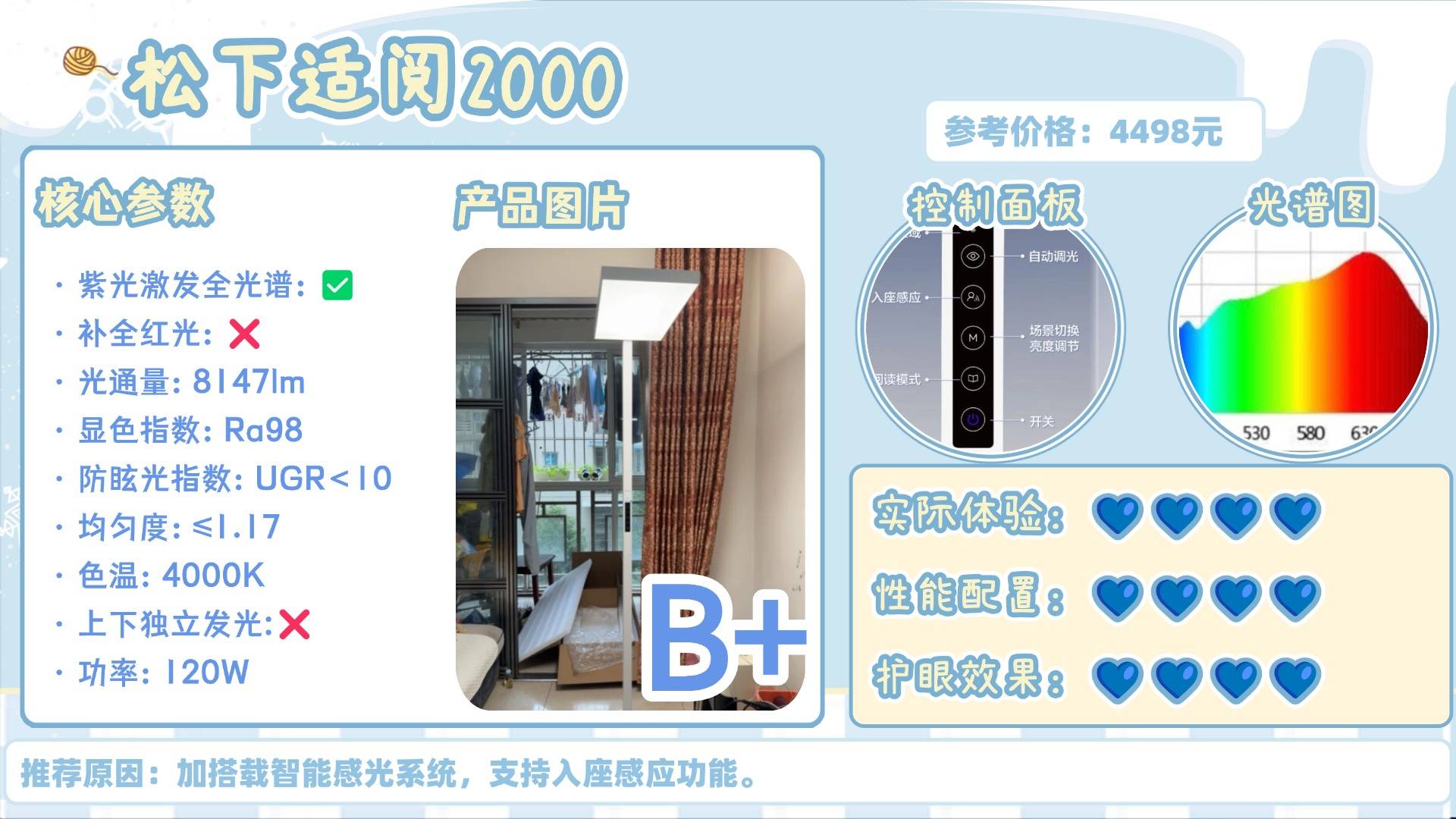 护眼大路灯第四名:松下适阅2000;显色指数维持在Ra98左右,色彩还原表现可靠。