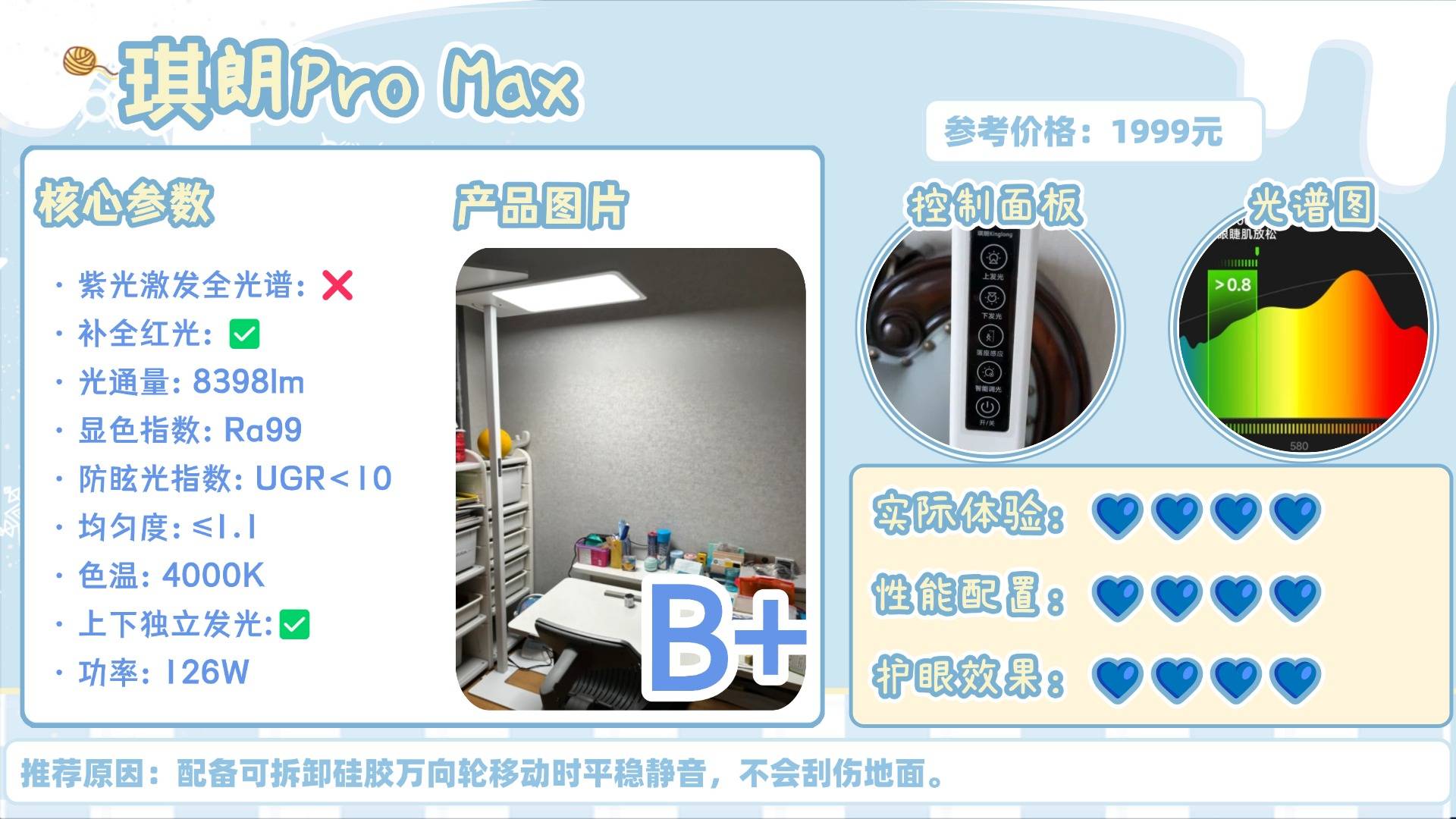 护眼大路灯第七名:琪朗Pro Max;配备可拆卸硅胶万向轮移动时平稳静音,不会刮伤地面。