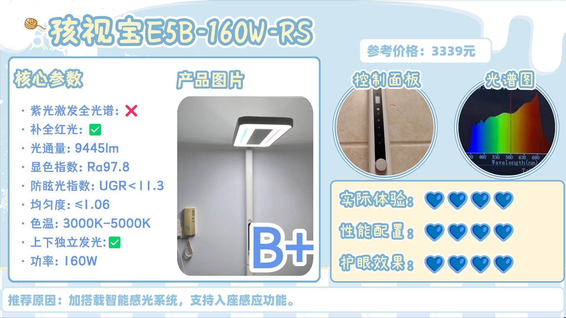 护眼大路灯第三名:孩视宝E5B-160W-RS;加搭载智能感光系统,支持入座感应功能。