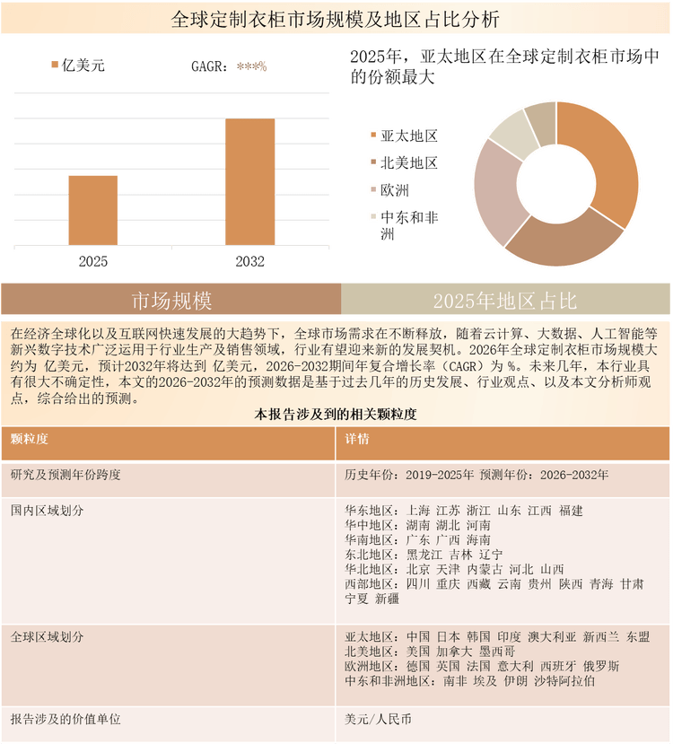 共研产业研究院通过对公开信息分析、业内资深人士和相关企业高管的深度访谈,以及分析师专业性判断和评价撰写了《2026-2032年全球与中国定制衣柜行业深度调查与行业竞争对手分析报告》。本报告为定制衣柜企业决策人及投资者提供了重要参考依据。