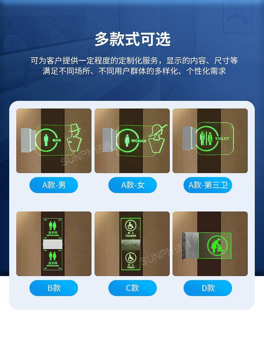 在款式设计上,系统提供了多款可选方案,满足不同场所的需求。除了基本的“有人/无人”显示外,还有针对男厕、女厕、第三卫生间、家庭卫生间等不同场景的定制化标识。