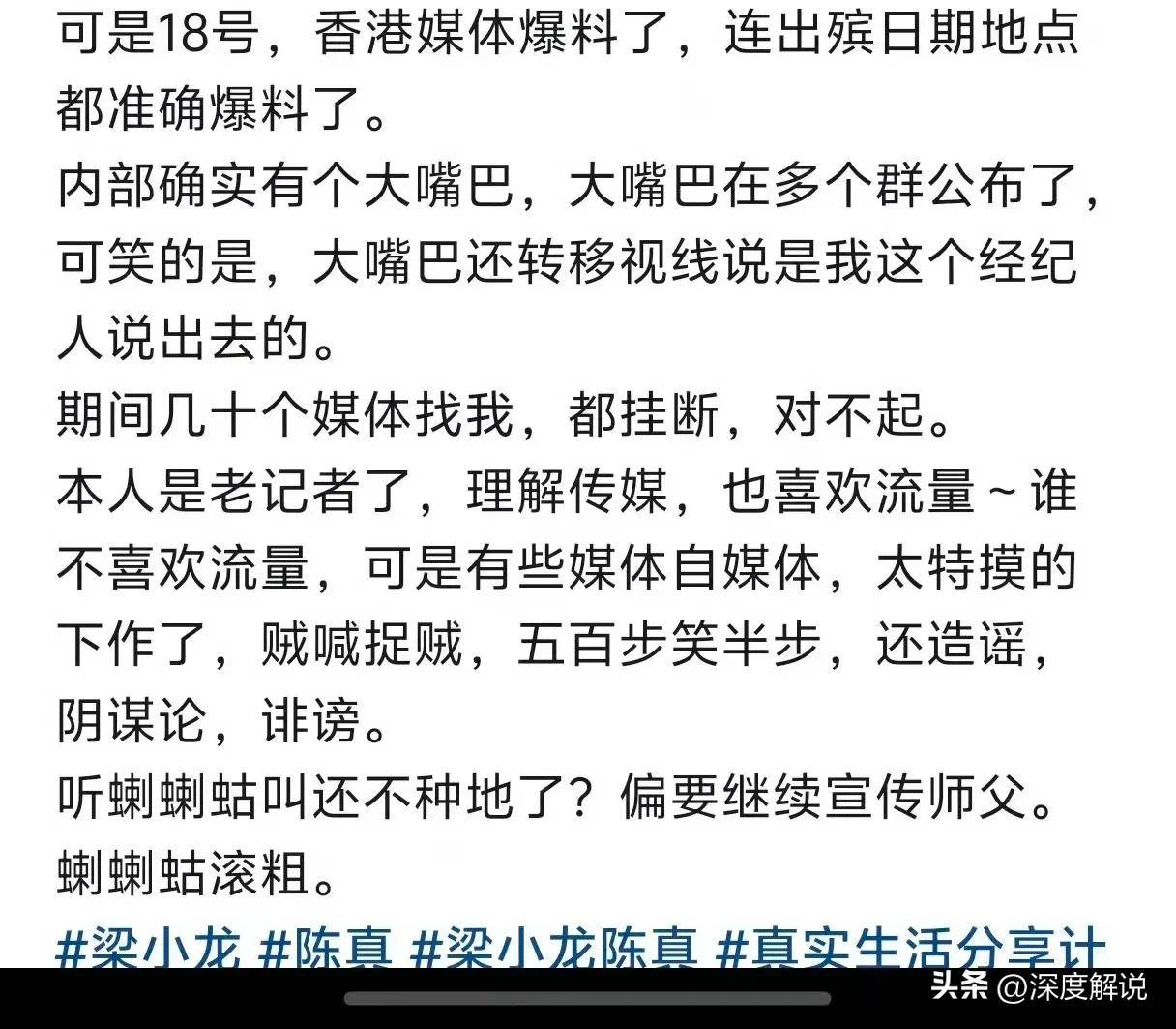 不仅如此,经纪人还控诉网络上的一些谣言和阴谋论。他表示,尽管自己已经保持了沉默很久,但仍然有一些网友以流量为目的,编造各种不实的故事,对梁小龙的去世进行恶意揣测,给家人和朋友带来了极大的困扰。这番言论的发布,不禁让人感受到一种隐隐的无奈和愤怒。