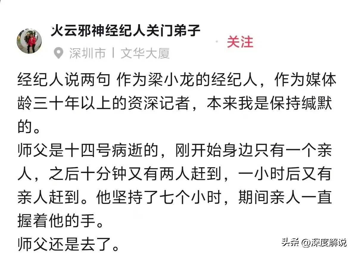 正当大家逐渐适应这个令人痛心的事实时,梁小龙的经纪人突然现身,发文向外界讲述了更多的背后故事。原来,这位经纪人自称是一名从事三十年媒体工作的资深记者,也是梁小龙的经纪人。他透露,梁小龙的去世实在是太过突然,令家人和团队措手不及。梁小龙发病时,身边只有一位亲人,10分钟后,另外两位亲人也赶到了现场,最后所有亲人都在一个小时之内赶到,紧紧握住梁小龙的手,给予他最后的勇气。尽管他们痛苦地坚持了七个小时,但奇迹并未发生,梁小龙最终未能抵抗住病魔的侵袭,离开了这个世界。