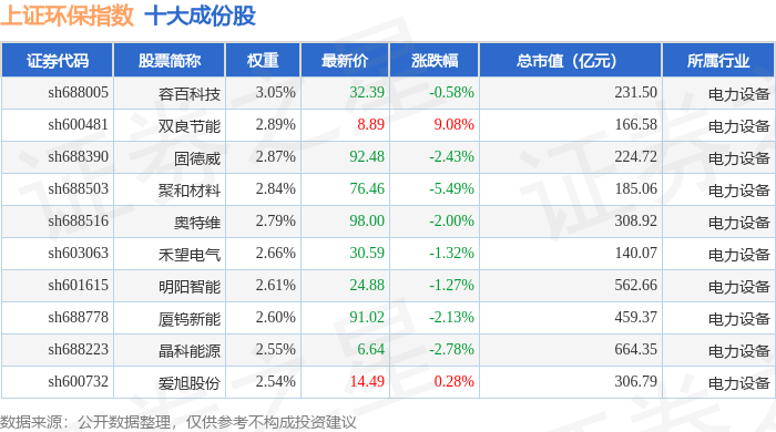 证券之星消息,1月28日,上证环保(000158)指数报收于1470.15点,跌1.4%,成交537.89亿元,换手率1.71%。当日该指数成份股中,上涨的有5家,双良节能以9.08%的涨幅领涨,下跌的有34家,聚和材料以5.49%的跌幅领跌。