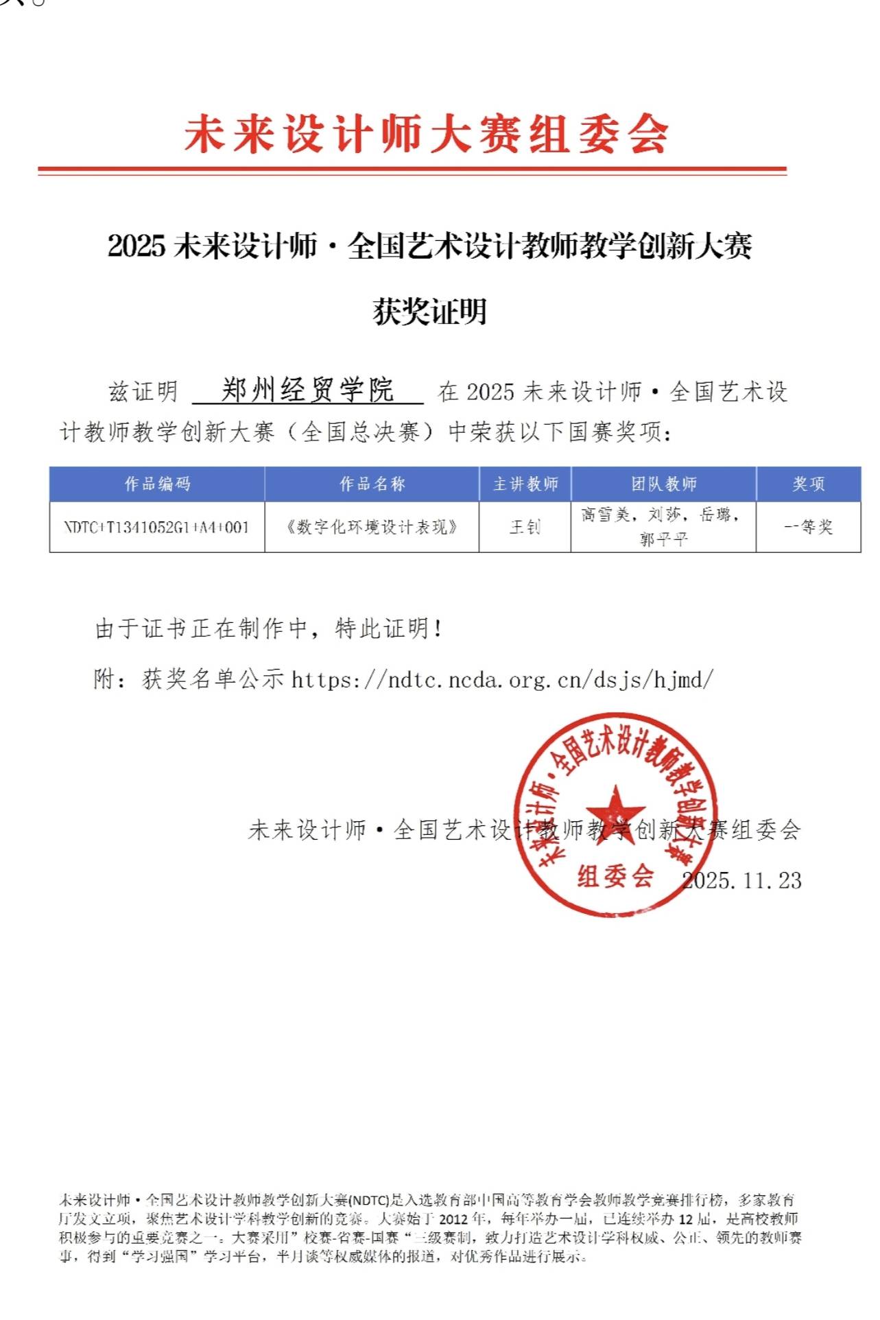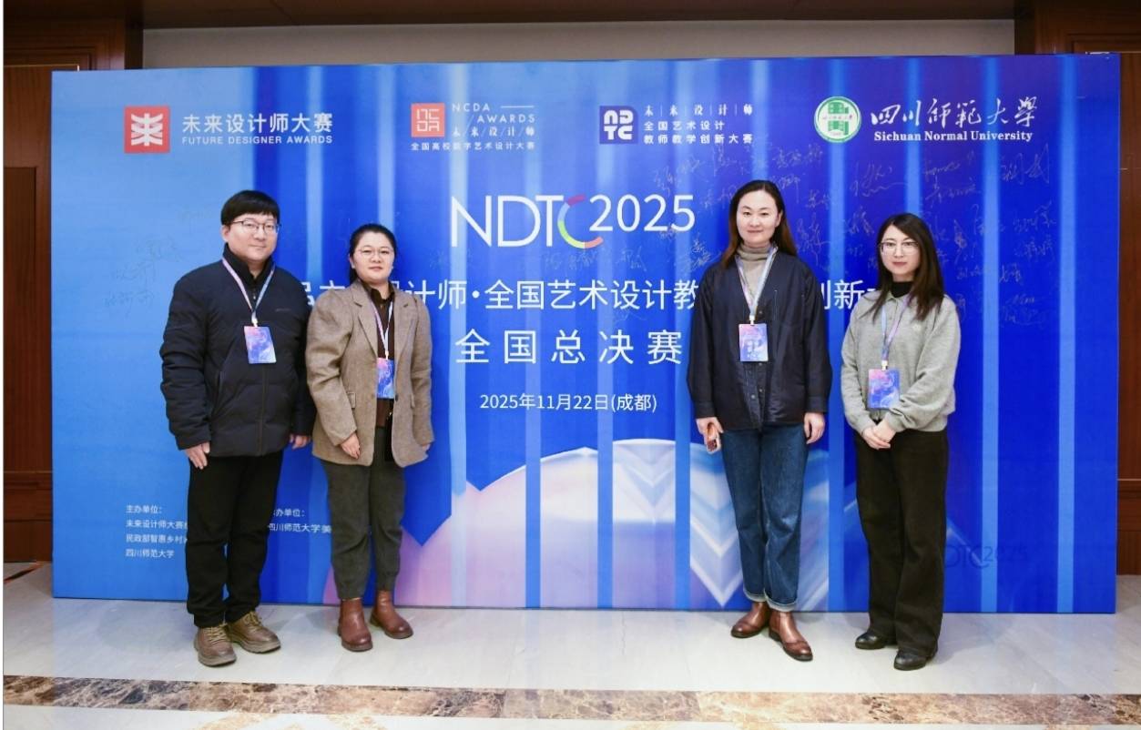 第13届未来设计教育论坛暨未来设计师·全国艺术设计教师教学创新大赛(NDTC)全国总决赛于11月22日至24日在成都举办,由工业和信息化部人才交流中心、未来设计师大赛组委会、四川师范大学联合主办,入选教育部中国高等教育学会教师教学竞赛排行榜,获多省教育厅发文立项,是聚焦艺术设计学科教学创新的权威竞赛。大赛采用“校赛-省赛-国赛”三级赛制,得到“学习强国”学习平台、半月谈等权威媒体的报道,获奖成果同步展示。全国总决赛参赛队伍均为各赛区省赛一等奖获得者,竞争激烈。我校参赛团队由艺术设计学院院长高雪美指导,环境设计专业教师王钊、岳璐、郭平平、刘莎共同组成。团队依托跨专业、跨文化、跨行业的融合创新优势,凭借精彩现场表现脱颖而出,成功荣获全国总决赛一等奖。在此前的省赛阶段,学院两支教师团队已分别获得一等奖、三等奖各 1 项。