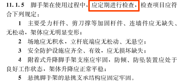 注意:GB 55023-2022《施工脚手架通用规范》中要求定期检查并形成记录。GB51210-2016《建设施工脚手架安全技术统一标准》仅要求定期检查。