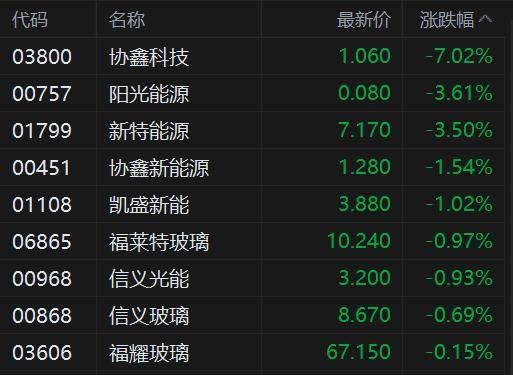 港股光伏股集体走低,其中,协鑫科技跌超7%,阳光能源、新特能源跌3.5%,协鑫新能源、凯特新能、福莱特玻璃、信义光能、信义玻璃均油跌幅。