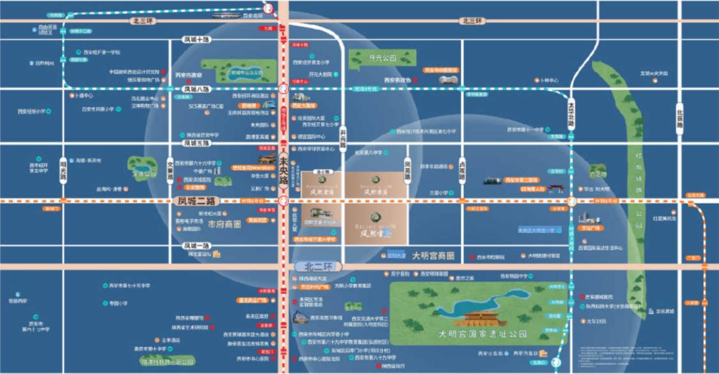 项目优踞西安城市中轴未央路,北二环金腰带,凤城二路与开元路黄金坐标之上。十年城熟,黄金地段臻稀百亩大盘,政经、交通、商业、教育、公园等配套高度集中,鎏金生活,出则繁华,入则宁静。