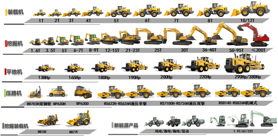 临工集团现有装载机、挖掘机、道路机械、矿山机械、高空作业机械、工业智能、新能源、农机等9大产品线,近千种产品型号。其中,装载机、矿山机械两类市占率全国第一,高空作业机械市占率全国第二,挖掘机市占率全国第三。