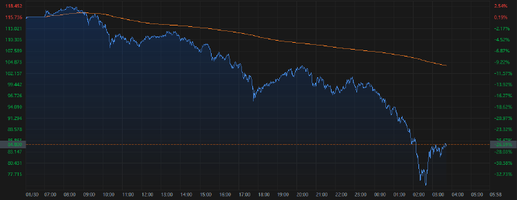 具体行情显示,现货白银价格自北京时间23:00开始加速下滑,凌晨02:40左右跌至盘中低位每盎司74.31美元,跌幅最大时超过36%。截至发稿,银价报85.8美元,跌幅收窄至26%附近。