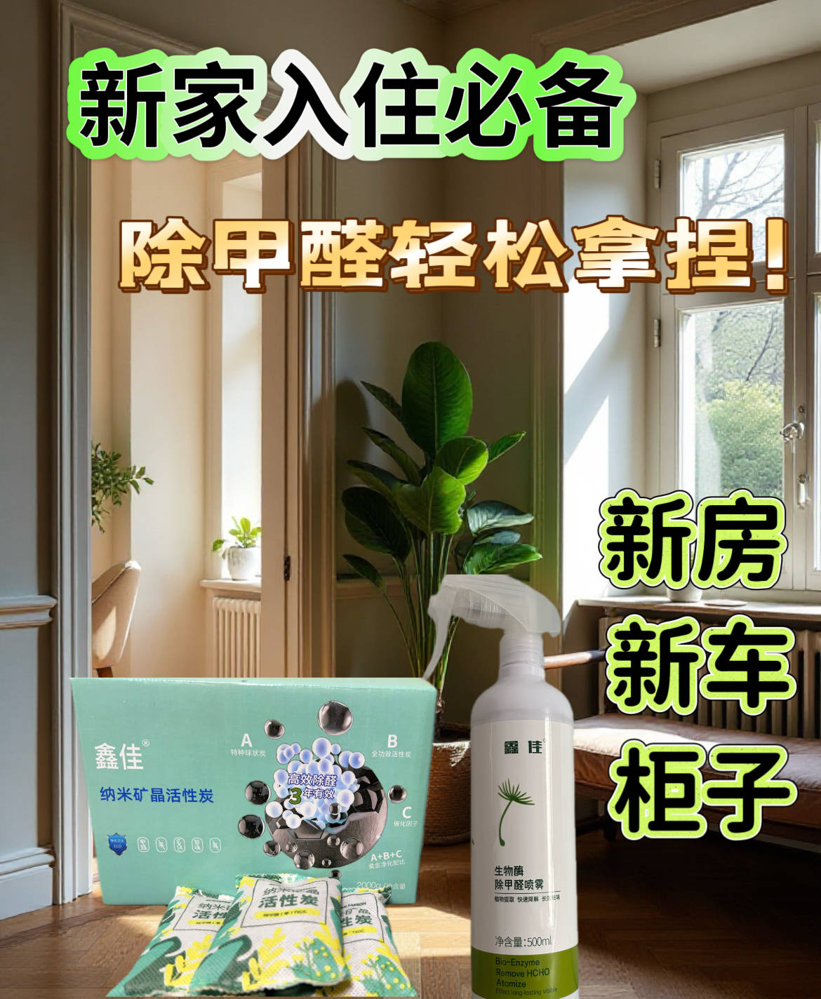 说白了,单纯通风只是“治标不治本”的除醛方法,想彻底搞定甲醛,不能只靠“吹”,必须做到“通风散表层+源头分解甲醛+长效吸附残留”,三步结合才是科学除醛的正确打开方式,而鑫佳除甲醛喷雾+鑫佳纳米矿晶活性炭,就是为了弥补通风的短板而生,和通风搭配使用,除醛效率直接拉满!