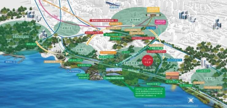 项目占据滇海东岸稀缺别墅用地,这里是滇池流域合规开发范围内距离岸线较近、可亲水瞰滇的珍贵区域,让您与滇池的浩瀚碧波亲密相拥。滇池,作为昆明的母亲湖,素有高原明珠之称,不仅是春城温湿度的 “天然调节器”,更是一幅绵延百里的山水画卷。清晨,当第一缕阳光洒在滇池水面,波光粼粼,水鸟翩跹,唤醒全新的一天;傍晚,伴着落日余晖,漫步在湖边,感受微风拂面,生活的疲惫悄然消散。