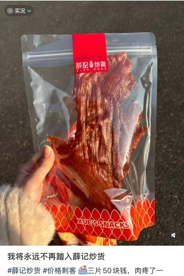 社交媒体上,消费者晒3片薛记炒货猪肉脯售价50元
