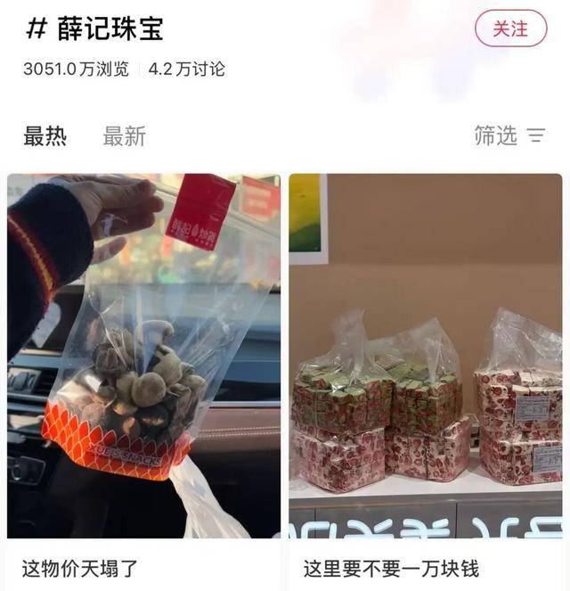 在社交媒体上,薛记炒货因其定价被网友戏称为“薛记珠宝店”“炒货界的爱马仕”“炒货刺客”等。截至1月28日,仅小红书平台,“薛记珠宝”单个话题阅读量就突破3000万。