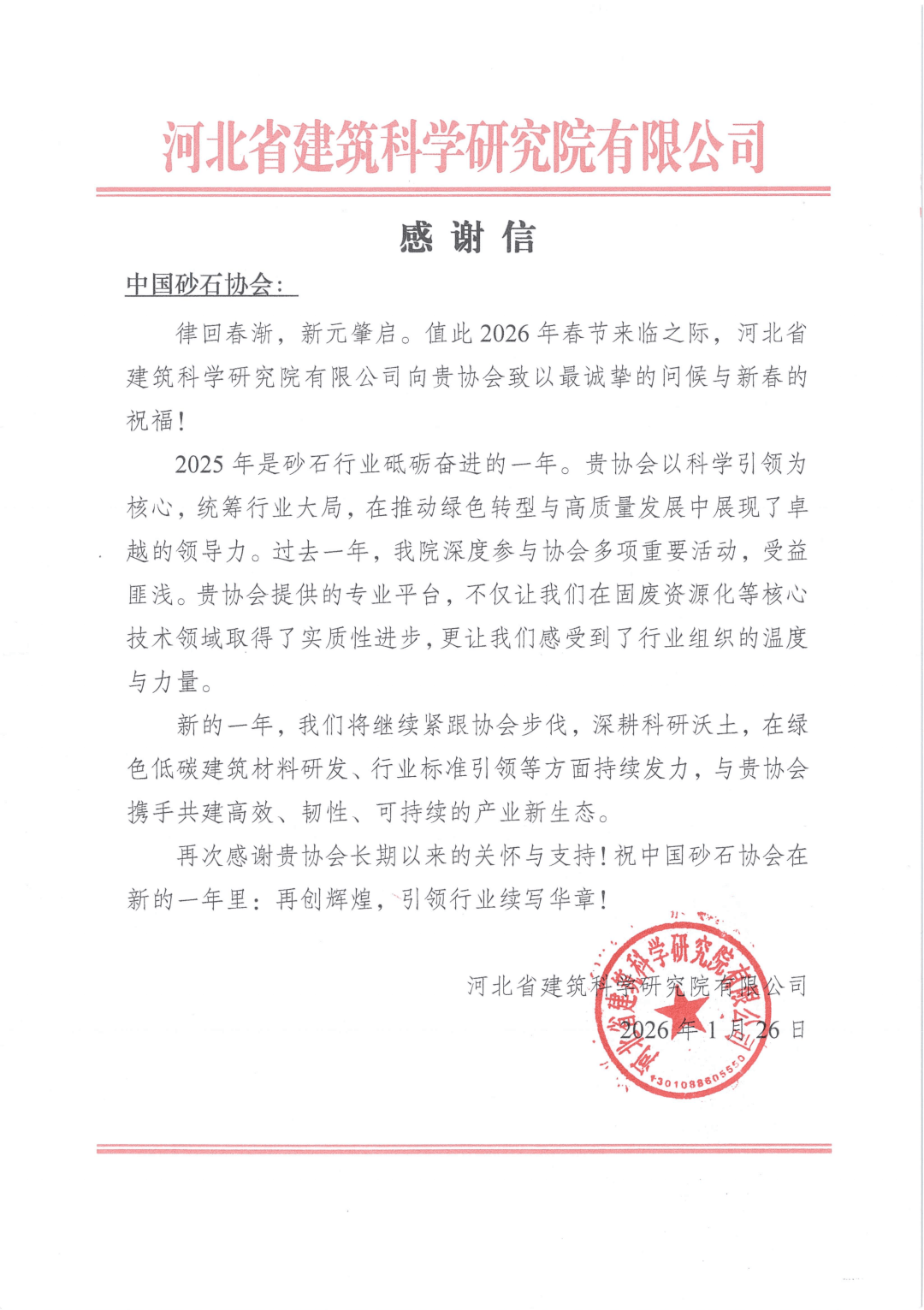 中国砂石协会收到河北省建筑科学研究院有限公司的感谢信,协会对此感到十分荣幸,感谢 河北省建筑科学研究院在2025年为行业做出的贡献。岁启新年,华章日新。新的一年我们携手并进,再创辉煌!