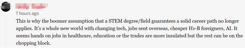 #这也是为什么老一辈人认为“读STEM专业就一定有稳定前途”的看法已经不再适用。如今是一个全新的时代,技术不断变化,工作被外包到海外,成本更低的H-1B外籍劳工,以及人工智能的冲击,都在重塑就业市场。