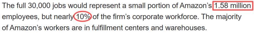 此次裁掉的3万名员工虽然只占亚马逊约158万名全球员工的一小部分,但几乎占公司企业(白领)员工总数的10%,企业(白领)员工人数约 35 万。亚马逊的其余人员主要在仓储、配送和运营部门。