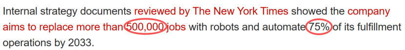 亚马逊一份内部战略文件显示,公司计划到2033年用机器人替代超过50万个岗位,并将履约流程的自动化水平提高至75%。