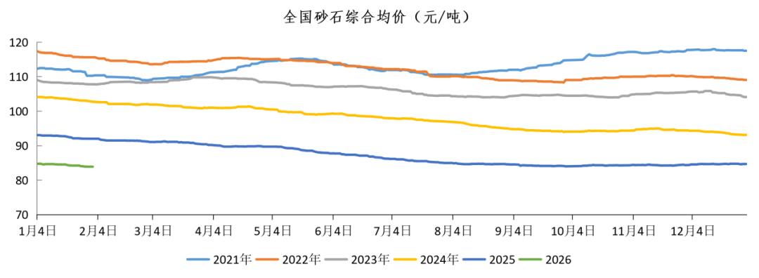 2026年1月第5周(1月26日~2月1日),全国砂石综合价格为84元/吨,周环比下降0.38%。其中机制砂、天然砂、碎石价格分别为73元/吨、106.6元/吨、72.2元/吨,周环比降幅分别为0.33%、0.34%、0.49%。