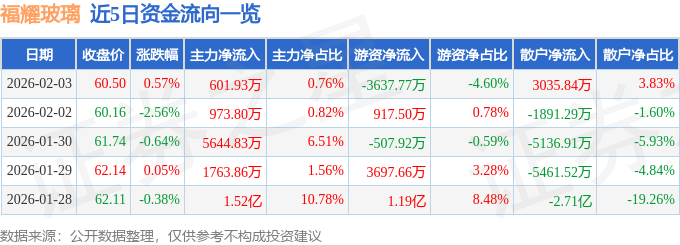 证券之星消息,截至2026年2月3日收盘,福耀玻璃(600660)报收于60.5元,上涨0.57%,换手率0.66%,成交量13.13万手,成交额7.92亿元。