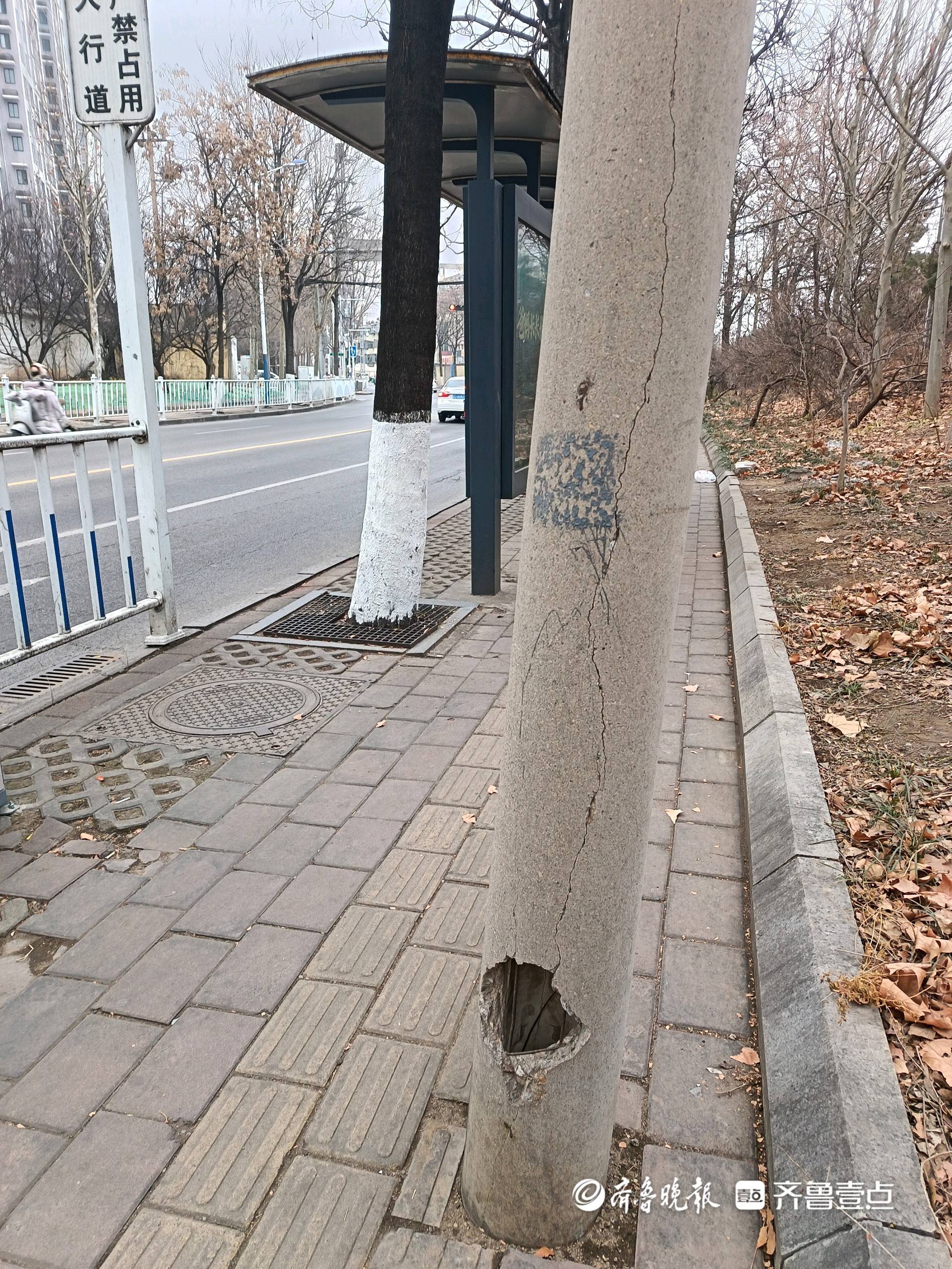 2月3日,情报员“从此不二色”向齐鲁晚报官方客户端齐鲁壹点情报站发来一则情报,泰安南湖大街15路公交站牌北侧十余米盲道附近,一根电线杆底部出现空洞,露出部分钢筋,存在一定的安全隐患,望相关部门及时处理。