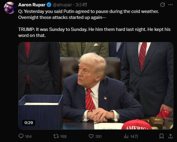 “(停火)从上上周日到上周日,然后就开了火,昨晚打得很猛,”特朗普回答说,“他(普京)信守了承诺。一周的时间很长。我们什么都愿意接受,因为那边真的非常非常冷。不过,袭击发生在上周日。他从上上周日一直停火到上周日。”