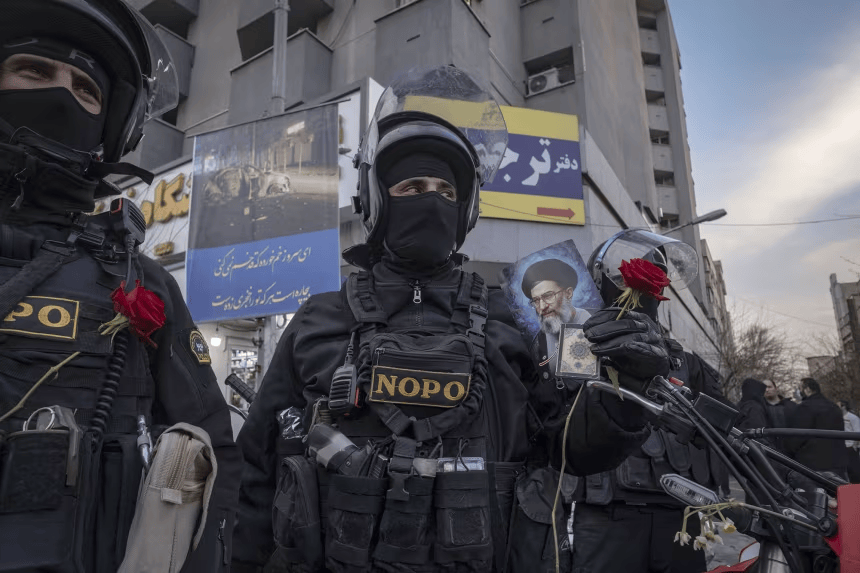 伊朗安全部队成员在1月12日于德黑兰市中心举行的政府支持集会上手持伊朗最高领袖哈梅内伊的画像